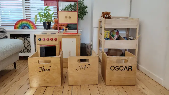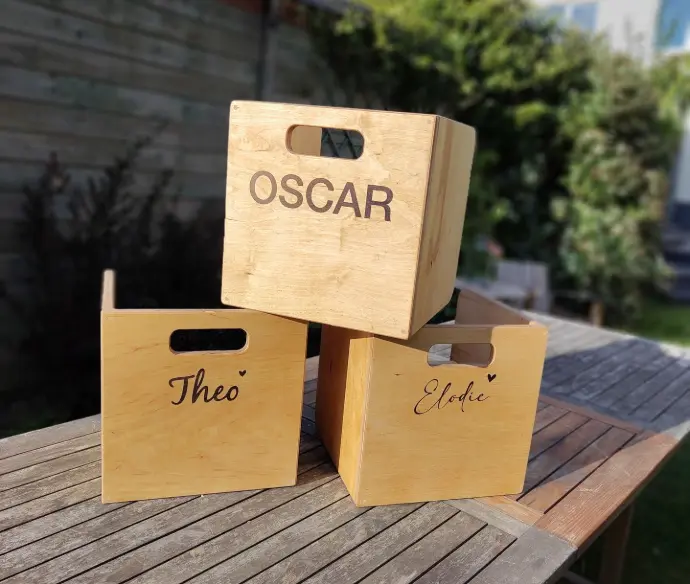 Met onze laser graveren we de naam in het hout. Het resultaat: een stijlvolle, duurzame en unieke personalisatie die een leven lang meegaat.